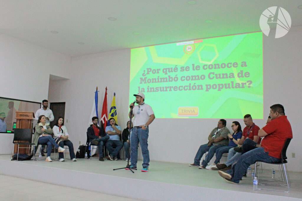 Participantes eligen sus preguntas en el tablero digital durante la Trivia “Febrero Victorioso en Reconciliación y Paz”.